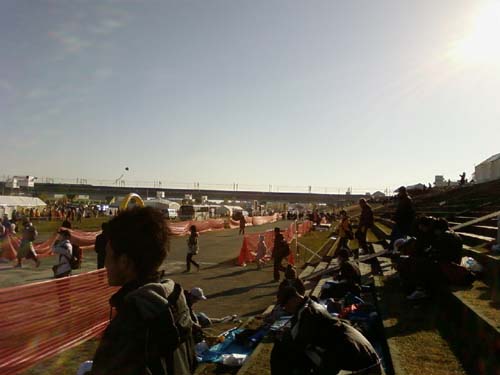 寝坊せず、目覚ましが鳴る前に起きました。4時41分でした。 5時53分に家を出て、浮間舟渡駅には7時前に着きました。 この数年は混雑を避けて戸田公園から歩いていたのですが、戸田公園から一人で歩くのは方向オンチで自信なかったので、ホームが空いていたので浮間舟戸駅で降りました。 ところが、エスカレーターがネックでかなり混雑していましたが、駅員の誘導で赤羽寄りの階段から降りられたので比較的早く出られました。 次回からは赤羽寄りの場所に乗って、もし階段付近も混んでいるようなら戸田公園駅に行くという作戦が良さそうです。 この時間でも電車が到着するたびにエスカレータや改札で混雑するのですから、遅くなればなるほど混雑は悪化するでしょう。 私がアップしているような時間にゾロゾロと到着するランナーも沢山いたので、時間が少しでも遅めになったら迷わず戸田公園にした方が良いです。 浮間舟渡からは無料の国際興業バスに乗りましたが、このバスに乗るのは5年前の初フル以来なので、なんだか感慨深かった。 会場入りしたのが7時半前、9時にスタートですから会場はまだまだガラガラです。 受付けを済ませて土手の階段部分に陣取りました。 風がだんだん強くなっています。寒い。 でも日射しは強そうなので顔には日焼止めを塗りました。 風が強く冷たいので、陣地は撤収せずウインドブレーカー上下を着たまま荷物を預け、ウインドブレーカーは陣地に置きっぱなしにしました。 盗難の危険はあるものの、保温優先の作戦ですが、これは大正解でした。 場合によっては安い雨ガッパでもいいから、とにかく十分なアップと保温が大切だと思います。 今年はじめて気づいたのですが、ゴール後に舟人鍋(せんにんなべ)というのが振る舞われているそうです。食べたかった。 それから銭湯(430円が200円に)の割引券が入っていました。 あと、写真屋が5社も来ていました。 一昨年まではテレビ東京がこの大会を題材にした番組を作っていたのですが、昨年はTBSになって、今年はどこのテレビ局も来ていなかったようです。 あと、もう高島平ロードレースのお知らせが入っていました。7月からの受付けだそうです。 スタート30分前にトイレに行ったのですが、その後また行きたいような気になったものの、すでにトイレは大行列でしたので、諦めてスタートラインに向かいました。 5100番台と今まで一番若めの番号なので、比較的前の方でした。 はじめて出た時は13000番台で、えらい後ろまで延々と歩いたなぁ、などと思い出していました。 昨年同様、合唱団(有名な人らしい)や吹奏楽団などが応援してくれていて、お祭り気分をかもしだしています。 しかし、風が冷たいよ。 向い風になる後半が早くも憂鬱です。 吹奏楽団の演奏するファンファーレが鳴り響き、いよいよスタート時刻が近付いてきました。 が、号砲は全く聞こえませんでした。 コーラスに見送られ、いよいよスタートラインを跨ぎます。 マンモス大会ですから走りやすい訳がありませんが、それでも入りの1kmは5分43秒とそこそこでした(ロスタイム含まず。ロスタイムは3分42秒でした) 2km以降も混んでて走りやすくはないです。 正直、流れに身を任せて走るなら周囲を見る余裕もあるんでしょうが、少しでも前を目指す走りだと沿道を見る余裕などありません。 前日のカーボローディングと言う名の過食が悪かったらしく、なんだか胸やけがします。 それに、もうトイレに行きたい。 やはり冷えが影響しているようです。 冷たい追い風を受けながら、5分10秒あたりで快調に走りながら、結局9kmでトイレに入りました。 立ちションしているのを見かけますが、この大会に限らずやめましょうよ。 私も前はやっていたので強くは言えないけど、みっともないよ、あれは。 山奥ならまだしも、一応人目があるんだから待たされてもトイレに入ろう。 10kmの私設エイドを探しながら走りましたが見当たらず、冷たい風だから急遽中止かなー、と思いながら、その先の私設エイドで声援を受けて気合いを入れて走りました。 10kmは53分でした(以下、すべてネットタイム)。 12km付近(帰りは30kmになる)で、走路の向う側でおにぎりエイドを準備している人達が大声で声援を送ってくれていて、「おにぎり作って待ってるよー」と言ってくれたのがすごく嬉しかった。 昨年は無給食を目標にしていたのでおにぎりは食べずに通り過ぎましたが、今年は喰うぞ。 早くもクリームパン(半分に切ってあった)とかザバスを飲みながらの走り、この調子なら4時間は切れそうです。 ハーフを1時間50分で折り返し、悪くないタイムです。 ただ、そこからは強い向い風になります。しかも冷たい。 折り返し直後はキロ5分11秒と健闘していたのですが、それも長くは続かず、すぐ25秒ぐらいに落ちました。 風はかなり強かった。 昨年のような強風とまではいかなかったけど、多少の風は気にしない私が嫌がる強さでした。 後半は抜かれる事の方が多い