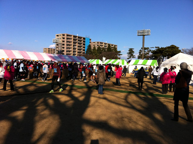****** 大会データ ****** ----- 大会寸評 ----- 今年で60回と歴史ある大会。 4時間以降は歩道走にはなるが制限時間も長く沿道の応援も多く、初心者からベテランまで楽しめる。 小刻みな高低差のあるコースなので、失速すると後半が辛い。 今大会から定員なしとしているので、今後の混雑が心配される。 ----- 概要 ----- 種目:10km、フルマラソン。公認大会。 最寄り駅:勝田駅から有料シャトルバスで10分。歩いても15分かからない。 スタート時刻:フルマラソンは10時半、今年から30分早くなった。 参加者数:マラソン 12,887人(男子11,248人、女子1,639人) 全体では21,301人 完走率:不明 制限時間:フルは6時間。 関門:あり。4時間30分で30kmの関門を閉鎖。 参加資格:特になかったような。 ----- コース・計測 ----- 計測方式:RSタグ1個。最近流行のヤツ。 計測内容:中間点、フィニッシュ。 記録検索:なし。大会翌日には公式ホームページに全選手の記録が載る。 記録証:即日発行、B5サイズ。 ペースセッター:なし。 ゼッケン枚数:2枚。 ゼッケン番号順:陸連と一般に分かれ、その中ではアイウエオ順らしい。 コース:勝田運動公園発着、勝田市内などを走る。折り返しはなし。 陸連公認コース、公認大会。 急坂ではないが坂がけっこうあり、ペース配分を間違えると失速する。 前半に突っ込むと後半が地獄なので、自制したレース展開を求められるコース。 そういう意味ではやや難易度は高い。 コース上トイレ:仮設7カ所、ガソリンスタンド等3カ所。 アップ場所:運動公園内外。 キロ表示:5kmごと。 スタート順:タイム順のプラカードに並ぶ。陸連は先頭ブロックでよい。 ロスタイム:先頭からスタートして30秒弱。 給水:8カ所、私設給水もあるので不足はしない。 スペシャル給水:なし。 給食:公設か私設かよくわからないが、バナナなどあり。 私設エイド:多し。小規模な物から恒例の気合いの入った物まで多数。 スポンジ:6カ所、ただ気温的にあまり使わないことが多い。 スタート前給水:なし。 ----- 環境 ----- 声援:多し。私設エイドも多く、暖かい雰囲気。 仮装:喜ばれる。数は不明。(ループコースなので後方にはそれなりにいるかもしれないが、見られず) 参加賞:長袖シャツ、60回記念タオル、完走芋(放射能検査済みで未検出)。 ゴール後の飲食サービス:紙コップでスポドリと水。 参加費:フル4000円と安い。 荷物預かり:貴重品以外のみ。100円。 着替え場所:テントがあったと思った。 会場トイレ:仮設多数、荷物預かり所の方には大量に設置されている。 プログラム:選手名簿兼用の立派な冊子。 写真屋:オールスポーツ。 招待選手:地元中心にいたような。 気温など:9時:0℃、12時5℃、15時:5℃ 風は南西2mから北西3m ----- 個人データ ----- 2日前の体重57.5kg、体脂肪9.1%、1日前の体重57.4kg、体脂肪8.3%。やや太め傾向。 相変わらず主食抜き生活。 装備はNB高機能帽子、アディダス黒長袖、MIZUNO青白半袖シャツ、リストサポーター(防寒)リストバンド、ロングタイツ、指なしソックス(アディダス)、シューズはイダテンGR。 ダメージは両足にまんべんなく筋肉痛、腰も筋肉痛、右アキレス付近に傷み、マメは左足裏など(軽度) 下り階段がキツイ痛み、当日夜は呼吸が苦しめだった。 中二日走れない程度なのでいずれも重度ではない。 |