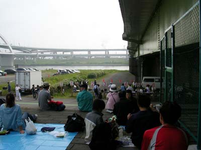 ![]() 参加賞のタオルと布袋。 ![]() 陣取った土手の上より撮影。 左のテントが荷物置き場。 スタートラインはこの左手で、右手方向(下流)にスタートします。 ![]() 時間が経って人も増えてきました。 |