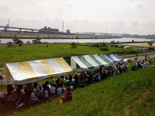 ![]() 会場に向うランナーの列。 手前のテントは荷物置き場です。 ![]() テントは荷物置き場ですが、居場所にしている人も多いです。 が、しつこいけど荷物置き場ですってば。 まあ居てもいいけど。 ![]() スタート前のコース上。 これから開会式とラジオ体操って時の撮影です。 向こうにエアドームが見えますが、そこから手前(下流)に向ってスタートです。 ![]() リタイヤしてから撮影。 スタートライン付近で、33.5kmになります。 2人のランナーは、これから上流の折り返しに向うところです。 緑線の向こうはフィニッシュした人。 |