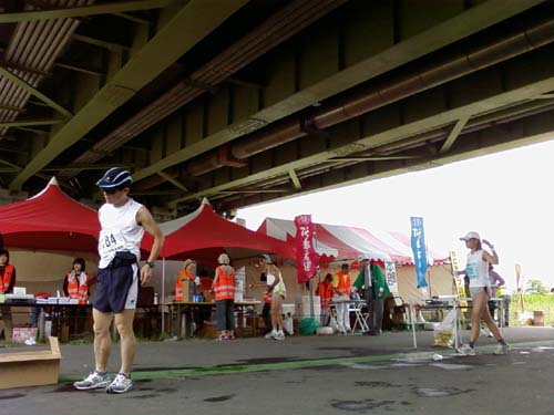 目が覚めたのが5時前、食事して薬を飲んで、鼻の奥の痛みがあるのでミントキャンディーをなめながら7時前に家を出ました。 駅で強力なミント飴を買って鼻の奥の痛みを紛らわしつつ、7時37分に駒込、7時44分に王子に着き、ランナーで混雑しているバス(1台目には乗れなかった。バス会社の人が案内していたけど、歩くと25分ぐらいらしい。)に乗って到着したのが8時15分ぐらいでした。 天気は曇り、風は涼しくそこそこ走りやすそうです・・・晴れなければね。 今回はフォアフット着地、ニ軸走法、骨盤前傾をテーマに走ってみる事にしました。 まあ、とにかくこんな体調ですからタイムは二の次と言いながらも、最低でも4時間は切りたいよなー、と思いながら着替えて軽くアップ。 正直、アップする気にもなれなくて(体調的に)、あっさりと済ませました。 一週間近く走っていないので、軽く足慣らしをした程度でやめておきました。 どうせラジオ体操があるし。 この大会、コース上で開会式があるのですが、普段は開会式には出ない私ですがなんとなくこの大会では必ず参加しています(なんか、そいういう雰囲気です)。 大会委員長から話があって、この大会はそばにある高速道路がオープンする時に高速道路上を走る予定で建設省と折衝していたそうです。 ところがその高速の建設が遅れに遅れ、その間に大会は回数を重ね、結局高速が出来て高速道路上で大会を開催していいと建設省から連絡があったのが数年前の12月、しかも18日前に連絡があったので、さすがに18日で大会を開催するのは無理で諦めたということがあったそうです。 この大会は荒川河川敷を2往復するのですが、なんとか1往復するコースに変更すべく役所と交渉していたが叶わず、という話は昨年聞きましたが、いろいろ裏話はあるようです。 仮設トイレも数を増やしたいけど許可が出ないとか、大会運営も大変なようです。 昨年同様、かっぱ天国(たしか赤羽)というJR系のスーパー銭湯と提携して、割引券を配ったりシャトルバスを出したりしていました。 それから、一昨年は35km付近の給水車が水切れになっていました(近くに水道がない)が、今回はどうやら給水車に補給する体制を取ったようです(昨年もあったのかもしれない)。 ただ、水が届く間では給水できないことにはなるのですが。 そんな挨拶があってから、恒例のラジオ体操です。ちゃら〜ん♪。 第一と第ニ、マラソンをしなければもう一生ラジオ体操なんかしなかっただろうと昨年と同じ事を考えながらの体操です。 それが終わってからスタートラインに移動(といっても、すぐそこ)。 例によって私は水を差したウエストバッグを持参しての走りです。 塩も持って行きました。(ゼリーも持って行くべきだった) 今回はこんな身体だし遠慮して後ろの方からのスタートにしました。 スタート前に委員長からコース、給水、トイレなど説明っがります。 プログラムなどの資料がないので、これは必ず聞きましょう。 コースは荒川河川敷を2往復するコースで、まず下流に向って走り、折り返してスタートラインを通過して上流折り返しを回ってまたスタートに戻って、ハーフの人はここでゴール、フルはここでたすき(ピンクのビニールヒモ)を貰ってまた同じ所を走ります。 したがって、何回もリタイヤするチャンスがありますし、救護の車も巡回しています。 リタイヤしやすいコースレイアウトです。 号砲が鳴りました。 関係者や遅れてスタートするハーフの選手達の拍手の中を走り出すのは気持ち良いもんです。 遠慮して後ろからスタートしたら、けっこう混んで走りづらかったです。 思ったより風が涼しくていい感じです(晴れなければね)。 私は水のペットボトルを持っているし、河川敷だから草野球場などの水飲み場があるからそこで水が補給できるし、給水を時々スルーしながらキロ5分半のペースで走っていました。 距離表示は2kmごとです。 10kmあたりからややペースアップした走りになっていました(といっても5分20秒台)。 フォアフット着地はアイディアとしては悪くはなかったのですが、じわじわと右足の裏が痛みだしました。 ハーフまでの距離ならもう一度試してみる価値はありそうですが、私の走力ではフルではちょっと無理のようです。 天気は晴れたり曇ったり、晴れると暑い。汗が吹き出ます。 しかも今年は腰痛で練習不足なので、暑さに身体が馴れてないのが心配です。 でもハーフポイントまでは順調でした。 中間点で1時間55分、正直もうすこし良いタイムかなー、と思っていたので期待外れでしたが、まあ後半スピードアップすれば3時間50分は切れそうです。 これなら、今年の北海道マラソンの完走は楽勝だな、と甘く考えていました。 甘かった。 後半、すこしづつペースアップの予定でしたが、ふくらはぎに痙攣の前兆のような嫌な痛みが走って、ちょっと焦りました。 私は今までふくらはぎがつったことはないんですよ。 こりゃ予想以上に汗をかい