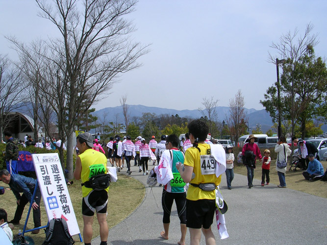【大会の様子】 荒川市民が強風中止という思ってもみない結果に終わったこともあり、結構気合いを入れて挑んだ長野でしたが、直前になって寝冷えをしてしまいました。 勝田以降、また低糖質を心がけた生活をしているのですが体重は落ちず免疫力もイマイチのようで、どうも中途半端です。 昨年9月に低糖質食を中止→11月末にまた再開→12月11日中止→勝田で太ったことを自覚して2月からゆるやかめに再開、ということで、長野ではゆるやかながら低糖質食状態でした。 体調ですが、直前まで喉の違和感を感じながらの長野行きとなりました。 今年の冬は寒暖が激しく、4月中旬になっても寒い日があり、なんと長野の前日は冷たい雨で一時は雪混じり、42年ぶりだそうです。 一泊だし軽装で行きたいのですが、ダウンジャケットに帽子と手袋と冬の出で立ち、はてはビニール傘まで持っていく始末。 (家を出た時だけ雨だった。) 傘は会場の荷物移動で邪魔になったようで、やはり折りたたみにすべきでした。 8時20分に家を出て9時には東京駅に到着、ちょっと早すぎました。 9時48分発の新幹線で一路長野へ、大宮付近では屋根に雪が残っていました。 トンネルを抜けて軽井沢に着いたときは一面の銀世界、15cmほど積もっていました。 (降雪量は21cmだったそうです) うわ、こりゃ降雪中止かなぁと不安になったのですが、長野市内には雪は見られずホッとしました。 11時35分にホテルに荷物を預け、12時に駅で立ち食い蕎麦を食べました。 この立ち食い蕎麦が妙に旨かった。 まあ若い女性が食べるのはちょっと雰囲気がアレですが、立ち食い蕎麦でこのクオリティは立派だと思う。 有料バスで受付会場に移動して、受付とEXPOをチラ見してから13時ごろ長野駅に戻り、昨年は足の故障で歩けなかった善光寺表参道をぶらつきました。 善光寺は随所で桜が満開、昨年のご開帳と違って今年は人出も普通で観やすかったです。 桜を満喫してから疲れたのでバスで長野駅に戻り、土産物を数点買って15時前にはホテルにチェックインしました。 安いホテルで、昨年は隣室の話し声が聞こえ、今年(911号室)はセントラル空調のファンらしき音がずーっと鳴りっぱなし。 まあ安いから文句は言うまい。 買ってから出番のない半袖シャツで走る予定でしたが、夜の天気予報で急遽長袖に変更しましたが、これは結果的には成功でした。 なんだか凄く疲れて、早々と横になりました。 腰も重い。 夕食は買ってきたおやきを中心に炭水化物たっぷりです。 休暇にお金使って遠くまできて早起きしなきゃいけないというのはどんな罰ゲームだよ、と文句を言いつつ5時に起床。 ホテルは朝食付きですが時間が合わないので部屋で食事を済ませて6時前にはホテルを出ました。 晴れて風はなく空気は冷たい。 絶好のマラソン日寄りになりそうです。 駅に向かうのはランナーばかり、6時17分発の臨時電車で北長野駅に向かいますが、途中でウトウトしました。 6時50分に会場に到着、スタートゲートに空気を入れていて、号砲の試し打ちをしていました。 準備と言っても脱ぐだけ、7時半にはアップを終えていました。 今年はタイツを回避したので、ちょっと肌寒い感じです。 7時50分に荷物を預けましたが、ビニール傘が邪魔で申し訳なかったです。 今年のゼッケンにはスポンサー名がなく(昨年はセブンイレブン)、これも不況の影響なのかな。 トイレは小は空いていましたが大は長い行列でした。 アップはサブグラウンドで軽く行い、陸連選手のみが使える競技場内も一応軽く走っておきました。 長野らしいキッチリとした進行で進み、スタートラインに並び号砲を待ちます。 昨年は気づきませんでしたが、ぺーサーが3時間、3時間15分、3時間半、4時間、4時間半と沢山いるのには驚きました。 招待選手の紹介のあとはQちゃんの紹介、相変わらずの人気ぶりです。 気温は13℃、無風、絶好のコンディションです。 さあ号砲、スタートラインのQちゃんに手を振り走り出します。 どうせテレビには映らないだろうし、それよりタイムの方が大切なので脇目もふらず走ります。 入りは5分3秒(ネット)、まあまあです。 今ひとつスイッチが入りませんが、まだ先は長い。 手袋はスタート直後に外し、長袖もほとんどめくったままでしたから、結果的には半袖で走っても悪くはなかった、そんな気温でした。 次に気がついたら4km地点、ペースは5分を切れない状態が続きます。 5kmラップが25分06秒、ちょっとペースアップしないと危険です。 気持ち速めに走っていたら、やがて4分55秒前後でまとまってきました。 序盤では給水所でのペースの乱れを嫌って、持参したペットボトルから飲んでいました。 15km付近までは悪くないペースでしたが、徐々に遅れ出すようになってきたので、ちょっと早いけど16km付近で今回の秘策の塩熱飴をなめ、給水でもスポーツドリンクを取りました。 Mウエーブ出口では昨年同様Qちゃんがランナーとハイタッチ、私も給水片手にハ