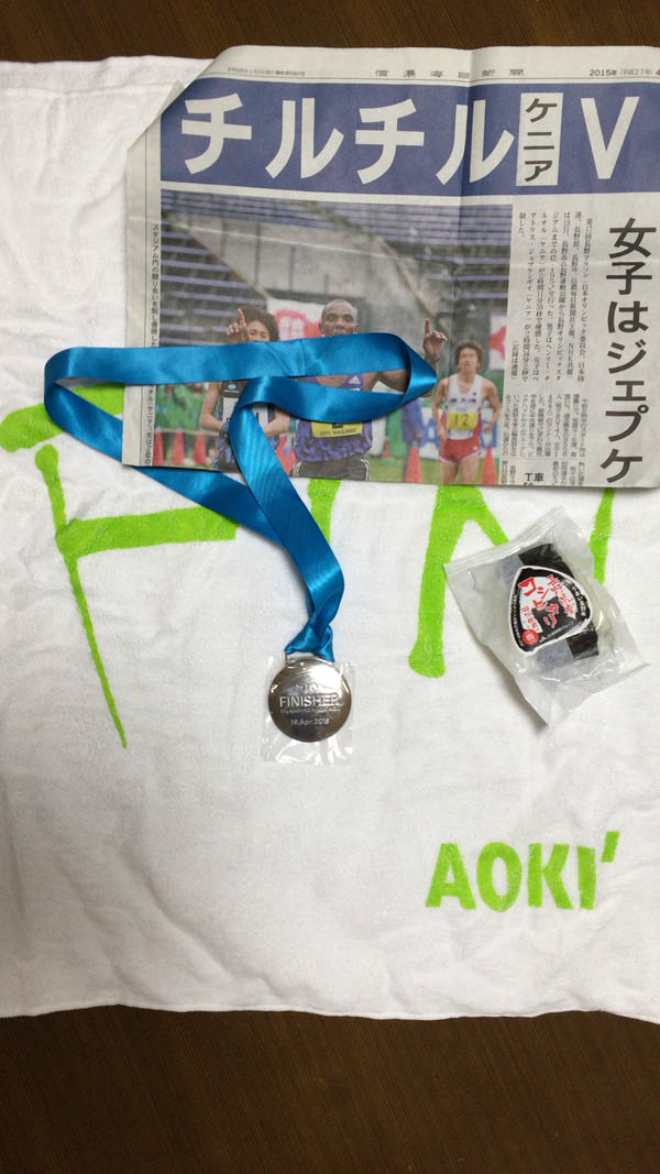 【レースの様子】 ぐっすり眠れましたが、ベットのせいか腰が痛い。 4時55分に目が覚めましたが、いい天気のようです。 朝食とトイレを済ませて5時50分にホテルを出ましたが、さすがに空気は冷たい。 コンビニでおにぎり買って6時に長野駅着、6時17分の臨時列車(3両編成)に乗りました。 一駅だから座らなくてもいいかと思ったのですが、とりあえず座っておいたらそれが大正解、かなりぎっしり満員になりました。 混み合う北長野駅を出られたのが6時27分、会場には6時50分到着。 会場に着いて改めて空を見たらかなり晴れそうだし、先月の板橋シティで復帰戦も無事終えられたのだからちょっとは冒険しようという気になり、急遽半袖に急遽チェンジしました。 下はどうしようか考えたのですが、まあ脚は暑さに鈍感なのでロングタイツのままにしました。 (着替えるのが面倒だし、日焼け止めを塗る面積も増えるし) ちなみに間違えてチップのあるゼッケンを背中に付けましたが問題ありませんでした。 週の中頃には25度まで上がるという予報もありましたが、予想気温は徐々に下がって、暑いどころか最低気温は3度などという予報に変わっていましたが、結局は5〜15度の予報と、この時期にしてはマラソンに適した気温になりました。 ただ朝は冷えるので薄手のロングコートは必携ですね。 7時15分には準備完了、おにぎりとゼリーを補給しておきました。 7時30分には荷物預けてトイレに行ってアップ、復帰戦では踏めなかった四股を踏むのが私の仕上げ方です。 しかし、日陰は寒い。 日光のありがたさが身にしみます。 Hブロック先頭に陣取りましたが、3時間45分のぺーサーさんが可愛い女性でした(遠藤範子選手)。 グロスタイムで走ることと、スタート渋滞のロスを25km付近までで解消するので、そこまでハイペースになるとの説明がありました。 スタート前はQちゃんが体操のお姉さんになって準備運動をしていましたが、人気は相変わらずです。 上空にはテロ対策で警察が飛ばしたドローンがピィーーンというプロペラ音をしながら飛んでいました。 さあ、号砲です。 1km表示は見落としましたが、2km手前で渋滞に捕まっているぺーサーを抜きました。 後で知りましたが5km〜10kmでペースアップして予定通りフィニッシュしたそうですので、このあと知らないうちに抜かれていたようです。 もし見つけてついていったら潰れてたか、それともタイムを短縮できたか。 ちょっと面白かったかもしれません。 でも抜かれた時に気がつかなかったので、ずっと後ろを意識しながら走っていました。 入りはペースが遅いけど、まあこんなものでしょう。 自分も周囲もだらっとした感じで走ります。 いつのまにか曇っていて、走りやすい気温です。 天気はスタート前が晴れ、その後は曇り、中盤以降は小雨交じり、スタート時点で10度、その後も最高で15度と、4月にしては絶好のマラソン日和でした。 善光寺付近の声援が多くてびっくりしました。 ネコの絵の抱き枕を抱えて乙女チックな衣装で踊りながら応援している年配女性がいましたが、前にも見た記憶が・・・。 地元の人なのでしょうか。 手袋は序盤で外し、そのまま付けませんでした。 中盤以降は帽子を取って走りました(その方が涼しいので)。 しかし、それでも4月にしては驚異的に走りやすい気温です。 10km付近で、今日は気温も低いし思いきって冒険しようという気になり踏ん張ってみたのですが、キロ5分20秒が限度。 まあ、これが今の力です。 20kmあたりから流れより速く走れるようになってきました。 混雑が緩んできたのと脚が乗ってきたのでしょう。 後方スタートだと周囲のペースに飲まれがちなので、周囲におまかせで走るとタイムは出ません。 中間点で時計を見たら3時間50分は切れそうなペース、でもこのペースを大切にするのではなく終盤に潰れて台無しになってもいいという気持ちで頑張ってみました。 序盤以外はジョギングではなくランニングができた気がしたのが、今回の大きな収穫です。 ![]() 先月の板橋シティと比較したグラフです。 長野は出入りは大きいものの平均して頑張っている様子がよく分かります。 両レースとも終盤に頑張っていることを考えると、まだ前半で力を出し切れていない気がします。 でも、タイムよりもランナーっぽい走りを序盤以外はできたので、今回のレースは満足できる内容でした。 終盤、尾崎好美選手がコース上でハイタッチしてくれました。 Qちゃんも土手でハイタッチしてくれ、手前にはQちゃん応援ポイントの看板も掲示されていました。 Qちゃんは、3年前は数カ所でハイタッチしてくれたのですが、今回は移動ポイントが少ないのか私のタイムが1時間ほど速いせいなのか一カ所でしかお会いできませんでした。 でも1回でもハイタッチできて満足です。 終盤は歯を食いしばって凄い形相で走りました。 必死に駆け込んだゴール、肩にかけてもらったフィニッシャータオルは暖かかった。 そしてメ