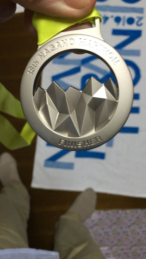 【レース内容】 5時25分に起きるが、腰が痛い。 この手のベットが硬いのか、我が家が柔らかすぎるのか。 もっと早く起きればよかったと後悔しつつ、急いで朝食会場へ。 まあ普通の朝食で、小さい茶碗に山盛りのご飯を食欲ないが詰め込む。 眠気が残っているとはいえ、ご飯を詰め込むのは記憶にない。 スクランブルドエックは酸味が気になって残しちゃった。 5時48分に食事を終えて、部屋のトイレに行って6時20分位にホテルを出ました。 風は弱い、気温はぬるい。 6時30分の列車は間に合わないと諦めて次狙いのつもりだったが、ギリ間に合ったので飛び乗った。 やはり5時には起きておけばよかったかな。 電車は空いてたが座れはしない程度。 予報は12度から24度、今年は半袖で十分かな。 6時38分に改札を出て歩いているうちに雨がぽつぽつ、7時に会場入りした時は風は強いが雨は止みました。 7時15分には着替えを終え、というか脱ぐだけで現地ではシューズを履くのと日焼け止めを塗るだけですけど。 ゼリーを飲み7時20分に荷物を預け、さあいくか。 トイレは1時間前でも小なら数分待ちと空いていますが、でも大(個室)は最初から行列でした。 どうも個室は男女兼用らしく、女性は可哀想です。 例年、会場入りがゲート組み立て真っ最中だったのに今年は見かけないからおかしいと思ったら、今年は強風のためスタートゲートは設置されませんでした。 気温は高め、スタート前に使い捨てビニールポンチョを着たが、待ってる間に脱ぎました。 どんより曇り、一瞬太陽が出た時は暑かった。 Eブロック最前線に陣取り、スタートを待ちます。 Dブロックのペーサーは3時間15分ペースの人でした。 熊本地震の犠牲者に黙祷を30秒、咳ひとつない時間でした。 さあ、スタートです。 入りは5分40秒と、相変わらずペースが上がりません。 フルのブランクが5ヶ月と長いので、身体に任して走ります。 9kmあたりから少しペースが上がってきました。 20kmから雨が降り始め風も強くなり、やがて本降り強風向かい風、まるで罰ゲームです。 全体の4割は雨だった感じ、私の晴れ男伝説もそろそろ店じまいかな。 給水はスポーツドリンクが目につき、序盤は水は見当たらなかった。 気温を考えて積極的に取り、珍しくバナナも2回程頂きました。 あとはミネラルのタブレットと飴(チェルシー)2粒、乾燥梅を数個。 今回もゼリーは持って行きませんでした。 中間点が1時間54分位、後半もイーブンとして3時間48分ですから、いいタイムとはお世辞にも言えません。 序盤の遅さによるロスがなくて終盤にペースダウンしなかったとしても3時間45分は厳しい。 まあ、結果は強風もあってイーブンが精一杯でしたが。 30kmでQちゃんにハイタッチ、手のひらが固かったのはあちこちの大会でのハイタッチのせいかしら。 20kmから30kmぐらいまでは出入りの多いタイムだが、グラフにして昨年と比べたらギザギザ具合が酷似。 これは坂と給水所の影響でしょう。 グラフのギザギザ傾向は同じですが、今年は18km以降が全体的に遅い。 特に29km以降は昨年よりずっと遅いタイムが続いています。 風のせいと思っていいでしょう。 ただ、もし30km以降が昨年並みで走れたとしても3時間46分台でしかなく、まあこれが今の実力としか言えない。 完全復活は時間的(年齢的に)無理かな。 強い追い風で40km過ぎにキロ5分01秒を記録した以外は5分20秒を切るのが精一杯、ラストスパートする体力は残っていなかったし、さいたま国際のように吊りそうになるとまずいし、でも全力は出しきった感じでした。 雨で冷えたと思ったら終盤はピーカンで気温も上がり、雪以外は全てありの天気でした。 終盤に、初めて道マラ以外で水かぶってみました。 これも作戦の一つでしたが、多少は効果あったかな。 ラスト近くで、少し前を報道が走っていましたが、取材らしい。 TVで取り上げている人の取材のようです。 ゴール目前、グロスで3時間50分切りを狙ったものの届かず。 自己計測ネットで3時間48分26秒、昨年より1分44秒遅いけど、まあこの風と練習不足ではこれが精一杯でしょう。 ゴールしたら号泣してる中年がいましたが、泣いてみたいなあ。 私はいくら練習してタイムが上がってもそれで満足はできないし、何年もかかって3時間半を切れた時も喜びは大きかったけど泣く気分にはなれなかった。 あの涙がどのぐらいの努力の成果かは知らないけど、そこまで自分を追い詰めてみたい。 ゴールしてアミノバイタルの粉とペットボトル500ml、梅おにぎり、フィニッシャーズタオル、完走メダルを頂きましたが、メダルは山を形どったもので長野らしいデザインでした。 ちなみにマラソンのスペルが間違っていたそうで、後日お詫び文章が公式サイトに載っていました。 大したタイムじゃないけど、でもまあ完走できて良かったかな。 昨年よりグロスでは43秒短縮、これはスタートブロックが前になっただけですが、でもこれが公式記録になるわけで、一応手ぶらじゃな