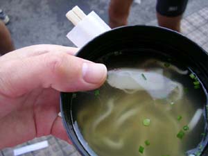 さて、マラソンですが、スタートしてから国際通りに入ります。 私は昨日沖縄に着いてから、会場とホテル周辺しか移動していなかったので、ここから先は全て初めて見る景色になります。 ![]() 国際通り。 お土産屋のメッカ。 ここでも凄い数のランナー。 一緒に走ったはこさんによると、ずーっと混雑してペースは上がらないみたいだし、もう完走だけが目的なので、とりあえず11kmまで一緒に走ることにしました。 最後まで一緒でもいいのですが早くもトイレに行きたかったので、11kmでトイレタイムを入れるまでは一緒に走ることにしました。 はこさんの観光ガイドを聞きながらの走りは楽しかった。 ランナーが多すぎてペースが遅かったけど、それすらも楽しめた。 5時間ペース、キロ7分で走り続けましたが、それでもランナーを追い抜く事があるほどのスローペースで流れていきます。 もちろん、もっと早いペースで追い抜いていく人もいましたが、ほんの少数。 やがて5kmの給水を飲んで、いつもならエンジンがかかってくる距離ですが、今回はまったりと話しながら走り続けました。 こんなジョグみたいなペースのマラソンもいいなぁ。 腕時計には5時間でゴールするペースとセットしました。 1kmごとにラップボタンを押せば、5時間でゴールするペースとの差を表示してくれるのですが、ほぼ5時間ペースで走り続けました。 今回は5時間ぐらいでゴールしようかな。そんな気分でした 何キロか忘れましたが、途中から1車線と狭くなったこともあって、10kmを過ぎてもバラけるどころか前も後ろも横もランナーだらけ。 噂通り、自己ベストを狙う大会ではありません。 早くも上り坂で歩いているランナーもいましたが、我々は順調にキロ7分ペースで走りました。 そろそろ尿意が限界になってきたのですが、なにしろ沿道の応援が多いから立ちションする場所がなかなか見つからないし、トイレを探しながら走っていると道ばたに立ちションポイントがあり、数人のランナーがいました。 マナー違反ではありますが、ランナーの多さを考えると、どこのトイレも混雑しているでしょうし、道ばたで失礼しました。 かなり我慢していたのでスッキリしましたが、大幅にはこさんから遅れてしまいました。 混み合うコースを縫うようにして走り続け、なんとかはこさんに追い付き、また一緒に走りました。 噂通り、私設エイドの数と沿道の応援の多さは凄かった。 私設エイドといっても、テーブルを出しての本格的なものから、お盆に塩や黒糖などを乗せただけの小規模なもの、さらにはコンビニのおにぎりを1コだけ持って差し出している人など、それぞれが思い思いの応援をしていて、楽しかった。 小さな子供が小さい手で飴玉を握りしめている可愛いエイドがあちこちにありました。 ![]() 鉄腕アトムの歌を歌い続けて応援する不思議な人。 私はサータアンダギー(沖縄の油菓子)とソーキソバエイドが楽しみでしたが、サータアンダギーは思ったよりも見かけなかった。 ソーキソバは、はこさんが一緒だったので確実にゲットできました。 ただ、そこで写真を撮っているうちにはこさんとはぐれてしまい、あわてて追い掛けたらひめゆりの塔を通り過ぎてしまい、お参りできませんでした。 ![]() ソーキソバ。 塩味強めの味付けが美味しかった。 しかし、中間点を通過したのに、21kmも走っているのに、まだランナーはバラけません。 さすが参加者日本一。 |
