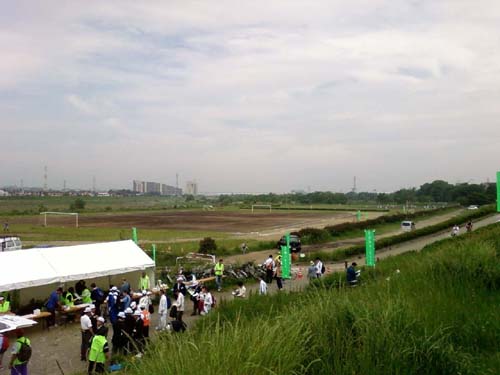 この大会は昨年も出ました。 昨年は人力計測でしたが、今年から10kmのみ試験的にタグでの計測をはじめたそうです。 長年、10km50分を切れなかったのですが、2005年10月にようやく切れて、昨年のこの大会では46分台と好記録、その半年後には42分55秒と大幅に更新できました。 たぶん、腰を入れて走るというフォームが身に付いたからだと思うのですが、その影響らしくアキレス腱やら腰やら、最近は故障だらけです。 それだけ身体に負荷がかかっているのでしょう。 速くなるための通過点だと思って耐えていますが、今回も腰痛を抱えてのレースとなりました。 4月に彩湖フルを欠場したときと違って、今回はなんだかレースが楽しみでした。 久しぶりにワクワクした感じ。 あまり気乗りしない時は無理に参加しない方がいいのかもしれませんね。 6時19分に目が覚め、7時10分に家を出ました。 風が出るとか雨っぽいとかの予報でしたが幸い曇りで無風、空気はひんやりしてマラソン日和です。 登戸に7時40分、そこから南武線で矢川駅着が8時16分、土地カンが全く無いのですがランナー達が沢山いたので後を付いて行きました。 会場には8時38分ごろ到着しました。 スタートは10時ですから、丁度良いぐらいですね。 いつもレースの前日ぐらいから大食いして、レースの時は胸やけするぐらいですが、今回は食べたりなかったのかもうお腹が空いていました。 レース前は水しか飲まないのですが、今回は珍しくポカリを飲みました(空腹対策)。 シューズは最近短距離レースで愛用しているライトレーサー、靴下はいつも通り5本指ですが、珍しく滑り止めのイボ付きが入手できたので、それを使ってみました。(アディダス。結果的には悪くはなかった。) しかし、最近できた私鉄JR両方で使えるICカード(PASMO)は便利ですね。 キップを買う手間がないだけで、こんなに楽とは思いませんでした。 それから、ようやくカメラ付き携帯を手に入れたので、最近はデジカメは持たずに大会に出ています。 よほど重要な大会以外は携帯のカメラで十分ですね。 ウエアは、某クラブ会員になって初心に戻るという意味も含めて、すでにレース用を引退し練習用になっていた黒いランパンを復活させました。 ただの10km大会ですが、私の心の中では色々と思う所があったのですよ。どうでもいいけど。 この時期は、ウエア選びに悩まなくて良いので気が楽です。 昨年同様、橋の下に陣取ってゼッケン付けてウインドブレーカー脱いだら、もう準備完了。 ちょっとアップには早いかなと思いつつもスタート前はトイレが混むことを思い出し、早めのアップをしてからトイレに並び、こんどはグラウンドで軽くアップ。 雑草が生えているグラウンドなので走りずらいです。 大会本部横で水が飲めるので、スタート前の給水もできて安全です。 (ただしコース上は一カ所しか給水はない) 最近は故障続きで練習不足、直前に1kmタイムトライアルを久々にしてみたところ、4分13秒とベストまであと一息という数字が出ました。 自己ベストを切りたいなー、と思いながらスタートラインに向いました。 昨年同様、前から数メートルの場所に陣取ってスタート。 無風、曇り、気温はやや低め。コンディションは最高。 グラウンドを2周弱する間に遅いランナーをパスして土手の上に出ます。 昨年は序盤で抜かれまくりましたが、今年はほとんど抜かれません。 600人近いランナーが狭い土手の上を走るのですが、グラウンド2周弱(約700m)でだいぶバラけるのか、昨年同様走りやすいです。 狭い土手、折り返しコースだし一般の人もいるし、左側しか走れないのですが、ランナーのマナーも良くて走りやすい。 キロ表示が5kmまでないのですが、たぶん3kmあたりからズルズル後退しはじめました。 10km大会だと最初から飛ばさないと消化不良で終わってしまうので、前半重視でいいと思うのですが、それにしても今回は前半で粘れなかった。序盤で燃えつきたか。 同じようなペースの女性ランナーを仮想敵にして、私がリードする形で戦っていたのですが、一度道を譲ったらもう離されるばかり、必死で付いて行ったのですが無理でした。 私は序盤で終わったけど、周囲はそこからエンジンがかかっていたようで、他のランナーにもじわじわと抜かれていきました。 そのうち一人旅になってしまって、こうなってくると自分でも分るぐらいダレます。 たぶん、大幅にペースダウンしてたんでしょうね。 5km地点が見えたのですが、ちゃんと係の人が5kmの看板を持って立っているのに、私はなにを勘違いしたのか「この先の折り返しを戻って、またここに来た時が5km」と勝手に思い込んで時計を止めませんでした。 その先の折り返しを回って戻ってきて時計を押したら25分過ぎています。 あー、やっぱり往路でここを通過したときが5kmだったんだなー。 給水は7km付近の一カ所だけと少ないです。 給水所で時計をみたら30分過ぎていたので、あと10数分でゴールだし無給水で