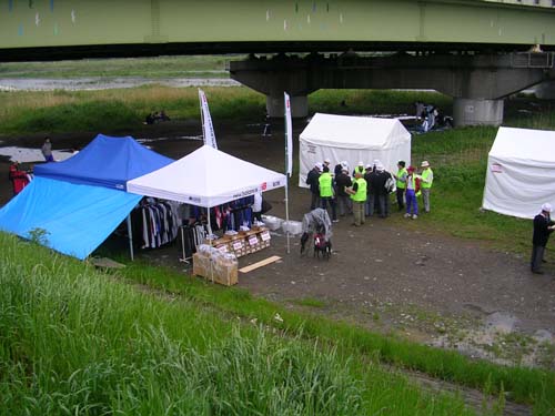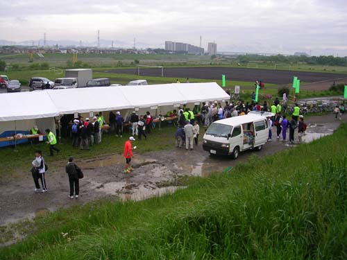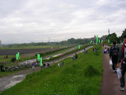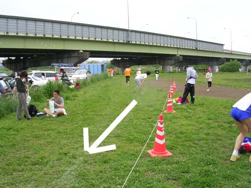 ![]() 会場風景。 朝方までの雨で一部ぬかるんでいました ![]() 白テントは男女の更衣室。 手前のテントはニューバランスのブース。 橋の下に陣どれるので、多少の雨でも安心です。 でも本降りだと人口密度が高くなるんだろうな@橋の下 ![]() 左に見える土のグラウンドを1周半して、中央の坂を上り、土手の上の舗装道に上がります。 グラウンドと坂だけ未舗装、あとは全て舗装道です。 ![]() 走り終わってから撮影しました。 ジョグしている人の方向にグラウンドを1周半してから白矢印の方向に出て坂を上がって土手の上に出るコースです。 *** 大会データ *** 種目:ちびっ子2km、5km、10km 参加者数:2km39人、5km166人、10k700人弱 最寄り駅:矢川(JR南武線)から徒歩15分 布ゼッケン前後2枚、ゼッケンの地色で距離(種目)、文字色で年令と性別を識別 参加賞:ランニングハンドブック(今年1月発行の号) 参加費:2500円 荷物:貴重品のみ預かりあり、着替えテントあり トイレ:仮設4基、全て男女共用、やや混んでいた 給水:2km地点(8km地点と兼用)とゴール後。内容は水のみ キロ表示:中間点(5km)と残り1km 計時:人力で全員の分を計測、結果は当日貼り出しと後日ネットで発表 ウエア:薄墨ランパン、ノースリーブアイスタッチ白シャツ、帽子。 シューズはゲルフェザーFT 今年は久々にEKIDENカーニバルか6時間リレーマラソン@夢の島に出ようと思っていたら、グズグズしているうちに両方とも仕事になってしまいました。 しかたなく、というのも言葉が悪いけど、日帰りで出られる大会を探していた所、この大会を見つけました。 友人が会場のすぐそば(歩いて5分)に住んでいるので、終わったら一緒に食事をする約束をしていました。 10kmのスタート時間が10時40分の予定だったのですが、道路(土手)使用許可の関係で直前になって9時50分スタートになりました。 小規模大会だから遠来の人はほとんどいないでしょうが、そういう人にとっては1時間近くズレるのは痛かったでしょう。 私はスタートが早くなってむしろ有難かったけど。 2月からのトレーニングを変えて、野村先生の教えの通りにシューズを変えたりしていましたが、まだ結果は出ず、といった状態でした。 3月の荒川は強風だけでなく今一つ調子が出なかったしかすみがうらは撃沈したし。 今回、久しぶりの10km大会でどんな結果が出るのか楽しみです。 直前に1kmタイムトライアルをしてみたら、自己ベストの4分半を10秒ほど上回って4分19秒と自己ベストを更新しました。 これは練習変更の一つとして、休日に右カーブのダッシュ10本を取り入れた効果だろうと思います。 今まではスピードトレーニングは全くと言っていいほどやらなかった(昨年は夏前に道マラ対策で多少はやったけど)ので、わずかとはいえスピード練習を取り入れるようになったのは進歩かしら。 今回のシューズは愛用のゲルフェザーFTにしました(そろそろ寿命なんですが)。 距離表示がどの位あるのか分らなかったので、作戦は特に考えずに走ることにしましたが、アップだけはきちんとするように心掛けました。 当日は雨が少し残る天気でしたが、濡れるほどではありませんでした。 5月とは思えない肌寒い気温で、走りやすそうな天候です。 (9時の気温14℃、気象庁に感謝したくなる絶好の気温でした) 矢川駅に8:45着、会場入りは9時の予定でしたが、1つ早い電車に乗りました。 思ったより駅から遠いので、結果的には早めに会場入りして正解でした。 トイレは4つしかなくて混んでいて結構待たされたし、早めの会場入りは気持ちにも余裕が出来て大正解でした。 受付けそばには橋があり、雨宿りできて便利です。 たぶん本降りの時には混雑して大変なんでしょうが、今回は空いていました。 2kmちびっ子の部のスタートを見送った後、10kmのスタートです。 土の競技場(路面は荒れぎみで走りづらい)を1周半してランナーをバラけさせ、狭い土手を走るコースです。 高低差はほとんどなし、土手はオール舗装です。 時々パラついていた雨はすっかり上がり、時折日が射していましたので、暑さ対策のために帽子をかぶっておきました。 どのあたりからスタートしていいか迷いましたが、まあそんなにハイレベルな大会ではなさそうだしかなり前の方からスタートしました(ネットとグロスのタイム差は4秒でした)。 でも実力以上の場所だったようで、序盤戦はバシバシ抜かれまくりました。 あー、やっぱり俺って遅いんだなー、本格派ルックのランナーに抜かれるのは当然としても、ウエアも体型も本格派からは遠いような人達にもスイスイ抜かれました。(微妙に失礼な表現ですね) コースは狭いのですが人数が少ないせいか、前の方からスタートしたせいか、混雑は全くなく走りやすかったです。 今まで出た10km大会で一番走りやすかったかもしれない。 一通り抜かれると、後は同じような走力のランナーが前後にパラパラといるような状態で走りやすいです。 5km地点で時計を見たら23分台、これはいけると確信しました