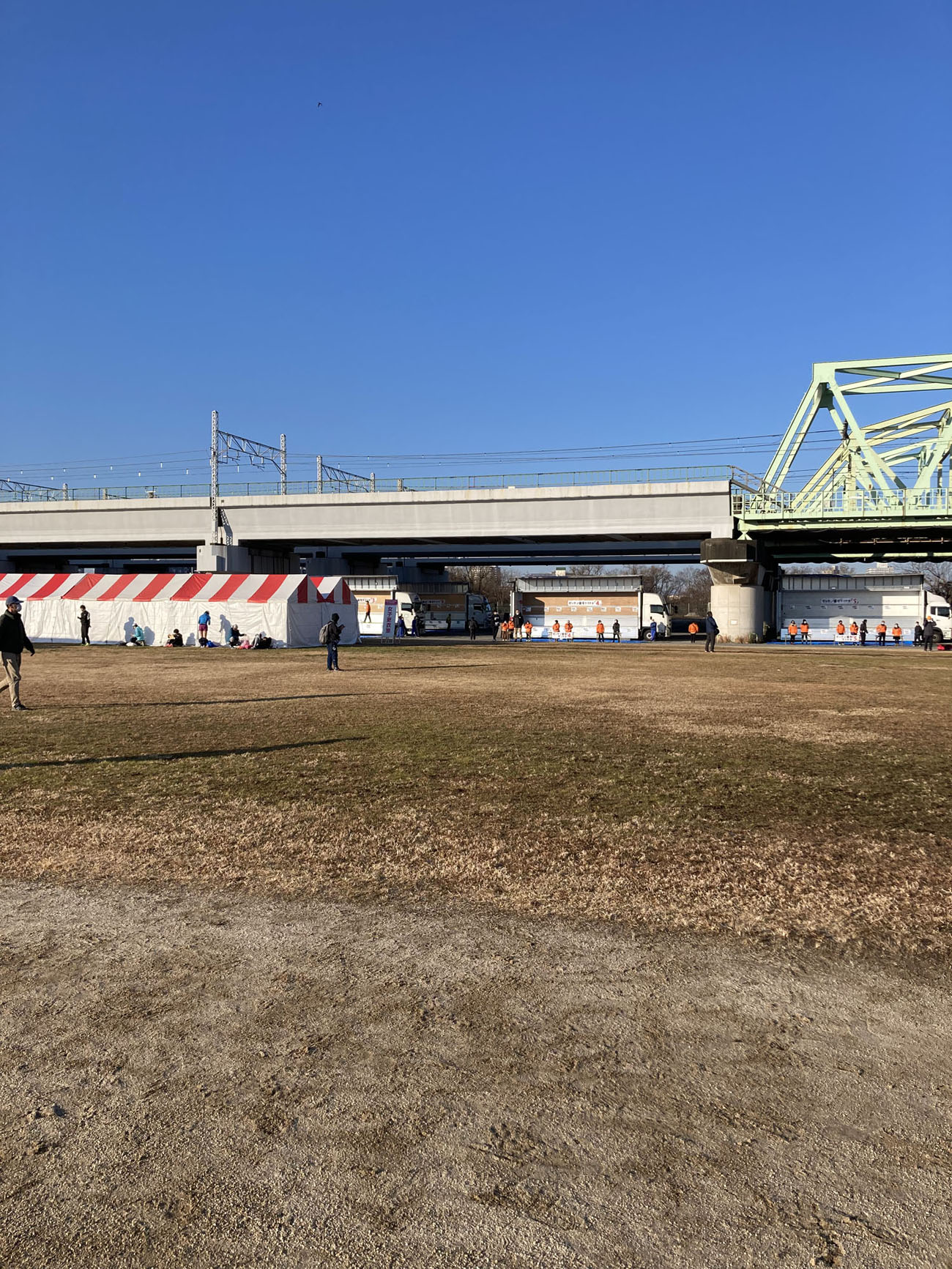 【レース当日】 年末に急に発熱して、珍しく38.8度まで上がりました。 熱は3日で下がりましたが下痢が1週間以上続き、あてにならない抗原検査は陰性、インフルエンザを疑って念のためタミフルを服用しました。 年末だったことと私のかかりつけ医はPCR検査もしていないし、発熱していると嫌がられるのでロキソニンと正露丸でしのぎました。 多少は体力は落ちたでしょうけど、まあそんなに影響はないでしょう。 12月のハーフでの15kmまでのタイムから1時間40分切り、100分を切るのが今回のノルマという気持ちで挑みました。 赤羽駅から移動する人が多いのですが、新荒川大橋の交差点が歩道が狭くて渋滞します。 遅くなるとその渋滞がひどくなることもあって、今回ははじめて赤羽岩淵駅から行くことにしました。 多少電車には長く乗るけど交通費も安く(私の場合ですが)、ストレスなく移動できます。 当日は5:15に起き、家を出たのが7:00、南北線に乗りかえて浦和美園方面に乗って、赤羽岩淵駅着が7:48。 なんか腹が痛いので、年末の下痢と昨年のレース中の腹痛があるので、めずらしく駅のトイレで個室に入りました。 数人の列ができていましたがさほど待たずに順番が来て、少しスッキリして8時ちょうどに駅を出ました。 3番出口を出たら右に行き北本通りを直進、橋を渡ったら右側から回り込むように河川敷に降りて会場へ向かいます。 会場着は8:10、まずは検温して物販ゾーンを通過、今年もコロナ対策で飲食系はないようです。 レッドブルのお兄さんから一缶いただき、記入した健康チェックシート(体温等を10日ほど記入する)をランナー入口で渡してリストバンドをもらいます。 ここ以降はランナー専用エリアですので、再入場する時にはリストバンドが必要です。 8:16に受付を済ませて、昨年と同じように荷物預かりのトラック近くの野球のグラウンドに陣取りました。 分かりやすいように水場のそばに陣取りました。 8:21に陣地設営、陽があって暖かいし、風も弱い。 防寒対策ですが、ランナー専用エリア内だし寒いのでコートを陣地に残し、ハンガーノック対策に赤飯おにぎりとゼリーを入れて、塩飴も舐めておきました。 8:40に荷物預け、野球のグラウンドでアップして2回ほどトイレに行って(小だったので比較的空いていた)、まだ30分近くありますがスタートの整列場所に移動します。 まだ青ゼッケンの第1ウエーブのランナーが整列している側で待機、ここで持ちタイムのプラカード順に並んでからスタート位置に移動します。 9:30、第1ウエーブがスタートし、続いて我々の整列ですが、出遅れた青ゼッケンの人がうろついていたりしました。 ちなみに指定のウエーブより前にスタートしたら記録なしですが、後のウエーブから出たら計測はされるそうです。 ただしグロスタイムは正規のウエーブから計時が始まっているので正式結果では相当遅くなりますが、ネットタイムは普通に記録されるそうです。 さあスタートの9:40が近づきました。 ずっと喋っているMCさんも1分前からは声を止め、On your marks、そして号砲。 リアル大会ならではの緊張感、いいものです。 1kmは4分30秒とまずまずながら、乗っている感じはしません。 そしてすぐ4分49秒に落ち、ひょっとしてキロ表示のミスかと思ったけど3kmではあっさり5分越え。 骨盤を前に伸ばす、後ろ足を高く上げる、腕振りはコンパクトに。 色々とフォームを意識するがキロ5分が切れない。 3kmから7kmまで5分オーバーが続き、もうレースにはなりません。 気持ちだけは切らさなかったけど、これでは目標の1時館40分切りどころか1時間45分オーバーかも。 なんとかペースアップしたいのですが、心肺を追い込むまで脚が回らない。 陽があって暖かいが空気は冷たく、いいコンディションです。 最初は長袖と手袋を装着、途中で袖はめくり、最後は手袋も取りましたが大汗をかく感じではなく、走りやすい天候でした。 スタート前に食べ過ぎたのか胸焼けを感じながら走りますが、どうやっても走りが乗らない。 第一給水が2kmあたりにあったのですが、走路の反対側なのでおかしいと思ったら、やはり復路の最終給水でした。 本来は取ってはいけないのですがまだ第1ウエーブのランナーが戻ってくるタイミングではないこともあって、私も含めて結構な人が取っていました。 1回多く取っちゃったことになります。 ちなみに給水は全て取り、全てアミノ酸ドリンクを取りましたが概ね濃過ぎる感じで量は控えめでした。 もう少し薄くていいから量はコップ半分は欲しいです。 7kmあたりからストライドよりピッチ優先にしてみましたが、結果的にはたいして変わっていなかったとはいえ、ストライドはほぼ変わらず少しピッチが上がっていました。 ひょっとしたらこれを意識した方がいいのかもしれないのですが、ただピッチもストライドも低レベルなのですが。 冴えないレースが続きます。 走路が狭く高低差がある折り返しに辿り着きましたが、遅いので