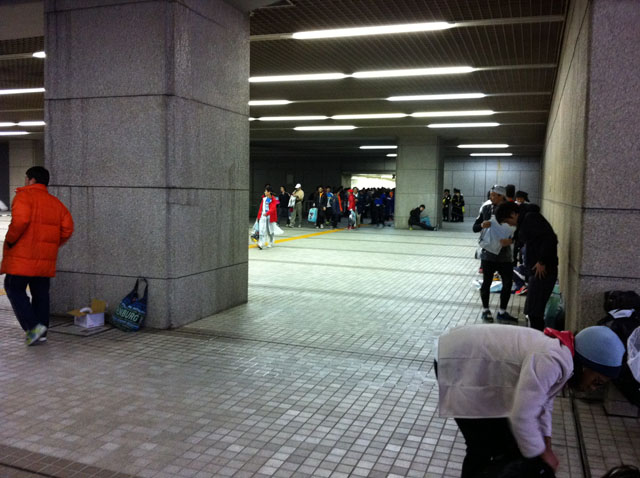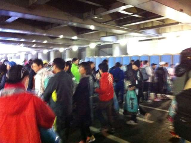 【写真と記録】 (自己計測ネットタイム) 時計故障のため、途中まで。 1km 4:52 2km 4:50? 3km 4:50? 4km 4:57 5km 4:51(24:21 0:24:23) 6km 4:57 7km 4:54 8km 4:56 9km 4:56 10km 4:53?(24:37 0:49:01) 11km 4:53? 12km 4:55 13km 4:57? 14km 4:57? 15km 4:56(24:34 1:13:40) 16km 4:56 17km 5:00 18km 4:55 19km 4:59 20km 5:00(24:50 1:38:33) 21km 4:57 22km 4:54 23km 4:58 24km 4:56 25km 5:01(24:48 2:03:22) 26km 4:56 27km 5:06 28km 4:51 29km 4:48 30km 4:46(24:45 2:27:52) (以下、不明) 公式発表(グロスタイム) 5km 25:03 (0:25:03 キロ4分53秒←スタートロスを抜いたペース) 10km 24:37 (0:49:40 キロ4分55秒) 15km 24:34 (1:14:14 キロ4分55秒) 20km 24:50 (1:39:04 キロ4分58秒) (half 1:44:33) 25km 24:48 (2:03:52 キロ4分58秒) 30km 24:45 (2:28:37 キロ4分57秒) 35km 24:40 (2:53:17 キロ4分56秒) 40km 25:09 (3:18:26 キロ5分02秒) GOAL 10:58 (3:29:24 キロ5分00秒) ネットタイム3:28:45、スタートロス39秒 以下、ネットタイムで計算 前半1:43:54(キロ4分55秒) 後半1:44:51(キロ4分58秒) TOTAL (キロ4分57秒) ![]() ![]() 木曜午後に行った受付会場(東京マラソンEXPO) 雨のビッグサイトです。 ![]() こちらが受付会場、ランナーのみ入れます。 ![]() EXPO会場です。 ![]() こっちはEXPOの入り口で、ランナー以外も入れます。 初日午後で雨ということもあり、空いていました。 ![]() ひっそりとしていたミドリ安全のブース、炎塩飴とタブレットを買いました。 両方ともオススメ、夏場の練習には必携です。 ![]() セブンイレブンが完走お守りとかおにぎり無料引換券を配っていました。 信仰心はないのでスルーしました。 ![]() 地下鉄のブース、過去のポスターなどが展示されていました。 ![]() こんなブースも。 手前には綺麗なお姉さんもいました。 ![]() 無料の記念撮影ブース、こういったのが好きな人にはいい記念になるでしょうね。 ![]() 綺麗なお姉さん。 モーターショーと違って綺麗なお姉さんは少なかった。 ![]() TOKYO Xという豚肉を使ったヤマザキの菓子パンを売っていました。 近所のローソンでも売っていました。 普通のメンチカツパンでした。 ![]() 土産に買いました。クッキー。やや高めで味は普通。 ![]() こちらも土産で買った人形焼、こちらも高めで味は普通。 仕事関係者へのお土産なので、高くても話題になればそれでいいのです。 ![]() 飲食屋台も充実。 でもさぁ、東京マラソンに宇都宮餃子とかってどうなんだろう。 宇都宮って東京じゃないよなぁ、まあいいけど。 ![]() 小雨の中、ビッグサイトを後にしました。 ![]() ここからは貰ったもの。 ボールペンはセブンイレブン、下のピンズは五輪誘致らしい。捨てちゃったけど。 ![]() 参加賞のシャツ、裾にこんなデザインが。 センス悪いなぁ。 ![]() 今年から(?)貰えるようになったRSタグ。 東京マラソンのロゴ、ゼッケン番号、開催日などが印字されている。 ピンク色が春らしくていい感じです。 ![]() 週末の地下鉄の中吊り広告です(セイコー)。 申し込むとフィニッシュタイムを載せてくれるらしい。 でも、その後見かけた記憶がないなぁ。 まあその車両に乗らないと見られないのですが。 ![]() こちらもその広告。 ![]() ここからは当日の様子。 西参道(明治神宮)の横断幕。 ![]() がらんとした西新宿の朝。 気温は6℃。 ![]() 消防車も集合しています。 ![]() 青い車はゴミ収集車。 3万人分のゴミはスタート場所だけでも大量になります。 ![]() 都庁周辺閉鎖完了。 東京マラソンだけで見られる非日常。 ![]() 地下通路を通ってスタート場所に向かいます。 ![]() ![]() カネゴン発見。 口の中にはお札が。 着ぐるみはレンタルだろうけど、中は暑くて臭いだろうなぁ。 ![]() ![]() 地下の広場とういか通路というか。 このあたりで着替えて準備しました。 ![]() トイレはそれなりにありましたが、時間が遅くなると大行列になります。 ![]() ![]() ![]() ![]() 交差点から四方を撮影。 とてもアップするような状況ではないです。 停まっているトラックは荷物預かり用。 ![]() ここからはレース後。 まずは準備中の足湯サービス、無料です。 ![]() 着替え用のスペース、ゴールした後に屋根の下にいられるのはありがたいです。 暖かいしトイレもありますし。 東京都内でのマンモス大会のゴールのゴール地点にビッグサイトは向いています。 海風と人口の少なさ(応援の少なさ)が難ですが。 ![]() 足湯中。 洗いもしない脚を入れているので、なんだか油とかゴミとかが浮いていて、いい出汁が取れているようです。 ![]() ![]() ![]() 完走タオルとメダル。 シャツ共々、ださいの一言。 この大会に限らないけど、シンプル イズ ベストって言葉をデザイナーさんに贈りたい。 |