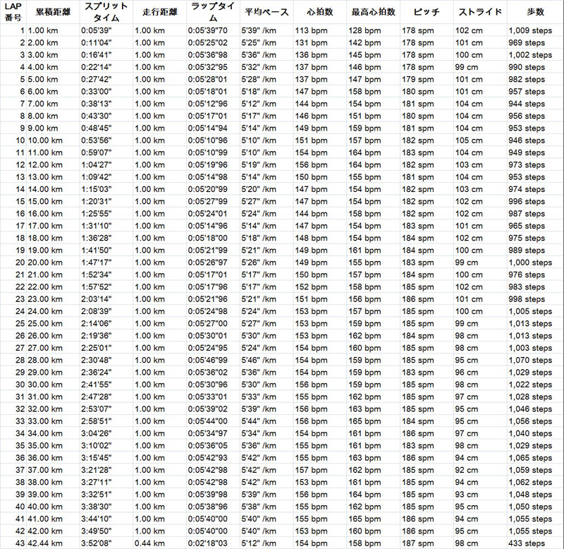 【写真と記録】 タイムは自己計測ネットタイムです ![]() GOAL 3:52:09 前半 1:53:39 後半 1:58:30 後半が5分落ちなのは最初から飛ばす作戦だったので、悪い数字ではありません。 走り込みとスピード練習で後半の落ち込みを抑え、かつ前半の貯金を増やして、あと2分10秒短縮を目指します。 もう一度3時間50分を切りたい。 ![]() 5分半を切れるとレースで走っている感が出ますが、20kmぐらいの長さをそのペースで走れたのは収穫です。 心拍数は意外と上がっていないもんですね。 ピッチは後半上がっていますが、ストライドは中間点以降落ちっぱなしです。 ピッチ上げてカバーしようとしたのでしょう。 ちょっとストライドが落ちすぎかな。 ![]() 土曜日夕方の研究学園駅(つくばエクスプレス)、応援の横断幕がありました。 結構うれしいものです。 ![]() 今年のホテル、駅近で便利です。 アメニティ類は最低限、無料朝食は6時からなのでマラソンにはちと遅い時間です。 ![]() イーアスつくばというショッピングモールに向かう途中の筑波山。 来年も見られるかしら。 ![]() 土曜夕方の研究学園駅前。 今年はイルミネーションが控えめでした。 シャトルバス乗り場はまだ準備前でした。 ![]() ホテルの部屋。 大浴場もないし、泊まるだけって感じです。 ![]() 部屋から外を撮影。 よくある田舎の駅前風景という感じです。 ![]() 当日5時の天気予報。 これでも十分絶好ですが、曇りならさらに絶好です。 ![]() 朝7時の研究学園駅前のシャトルバス乗り場の様子。 ガラガラです。 ![]() 筑波大学に着きました。 秋だなぁ。 紅葉は学園内は終わった感じでしたが、沿道のイチョウが綺麗でした。 ![]() ここからはレース後です。 会場内の飲食ブース。 昔はなかった気がする。 お土産も売っていましたが、ほとんどは飲食ブースでした。 ![]() 帰りのシャトルバスの行列から撮ったラストスパートのランナー達。 逆光で見づらいのでしが、トラックを左方向に走っているのが4時間45分あたりのランナー達です。 ![]() 半円のドームがゴールです。 ![]() シャトルバスの行列もようやく折り返しを過ぎました。 先は長いです。 ![]() フィニッシュ後に頂いたもの。 ポカリイオンウオーターは飲んじゃいましたが、その他には菱沼醤油の貴醤油(これは今年初登場のはず。ここの紫峰は旨いですよ。)、うまい棒二本、チョコ。 チョコも美味しかったですし、うまい棒も安定の味です。 メダルもタオルもないのがつくば、やや硬派です。 |
